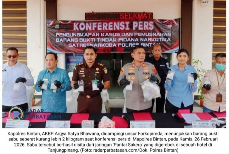 “Tim Satresnarkoba kita bergerak melakukan pengejaran ke Tanjungpinang. Hasilnya, petugas menggerebek Kamar 305 Hotel Bona Ventura. Di sana, tiga tersangka berinisial ML (33), NF (37), dan DL (36). NF dan ML ini suami istri,” sebut AKBP Argya Satrya Bhawana saat menggelar konferensi pers di Mapolres Bintan, Bintan Buyu, Kamis (26/2/2026) pagi.